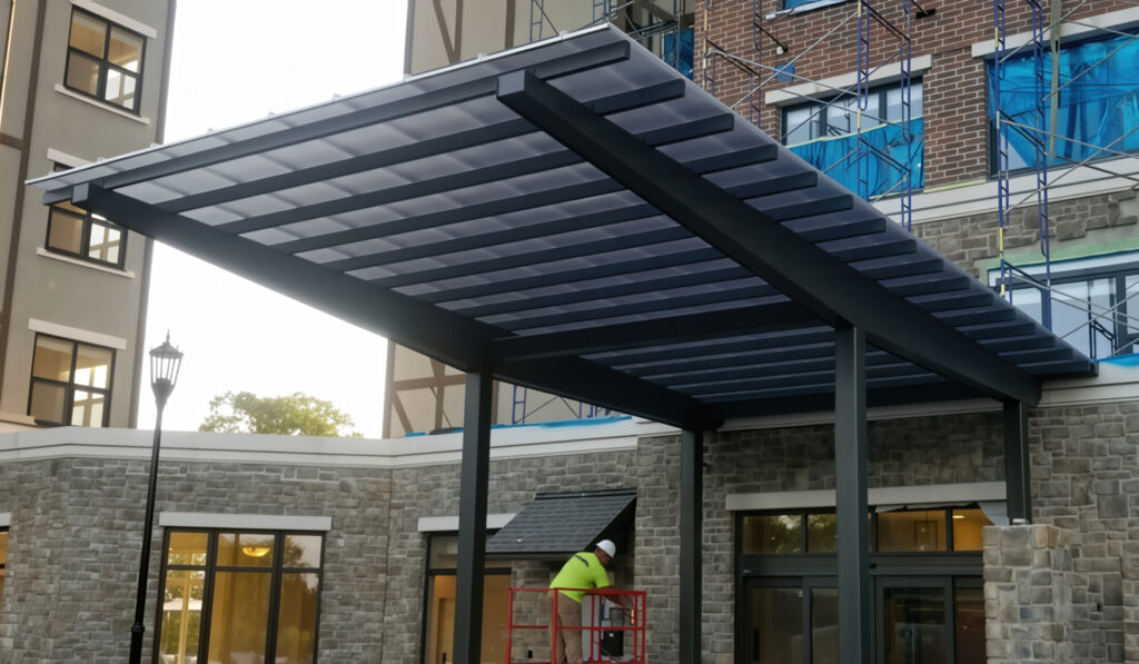 Our team has been satisfying clients around the country for many years with the right commercial metal canopy design. From hospitals and apartment buildings to retail spaces and restaurants, the use of metal canopies is the preferred option for all of the reasons stated above. From providing protection from the elements to being a piece of advertising to creating a useful space for a variety of needs, your metal canopy will serve you for many decades.
